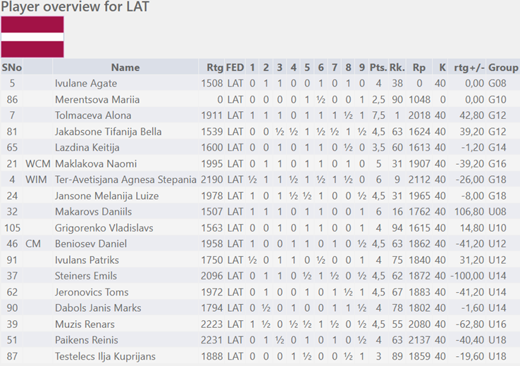 Stabilu sniegumu čempionātā demonstrēja Naomi Maklakova, zaudējums pēdējā kārtā diemžēl neļāva pakāpties augstāk. Rezultātā – 5 punkti un 31.vieta starp 87 dalībniecēm U16 meiteņu grupā. Visi Latvijas jauniešu rezultāti apskatāmi šeit, chess-results.com