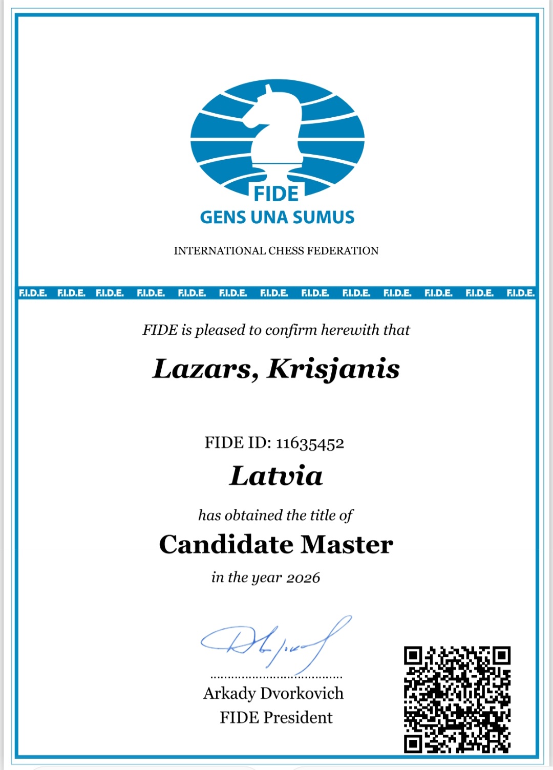 Ar prieku paziņojam, ka Starptautiskā Šaha federācija (FIDE) ir apstiprinājusi FIDE meistarkandidāta (CM – Candidate Master) titula piešķiršanu Rīgas Šaha skolas audzēknim Krišjānim Lāzaram. Apsveicam Krišjāni ar CM titula iegūšanu!