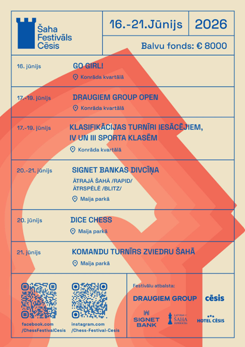 Papildu informācija festivāla organizatoru Facebook lapā Chess Festival Cēsis/Šaha festivāls Cēsis