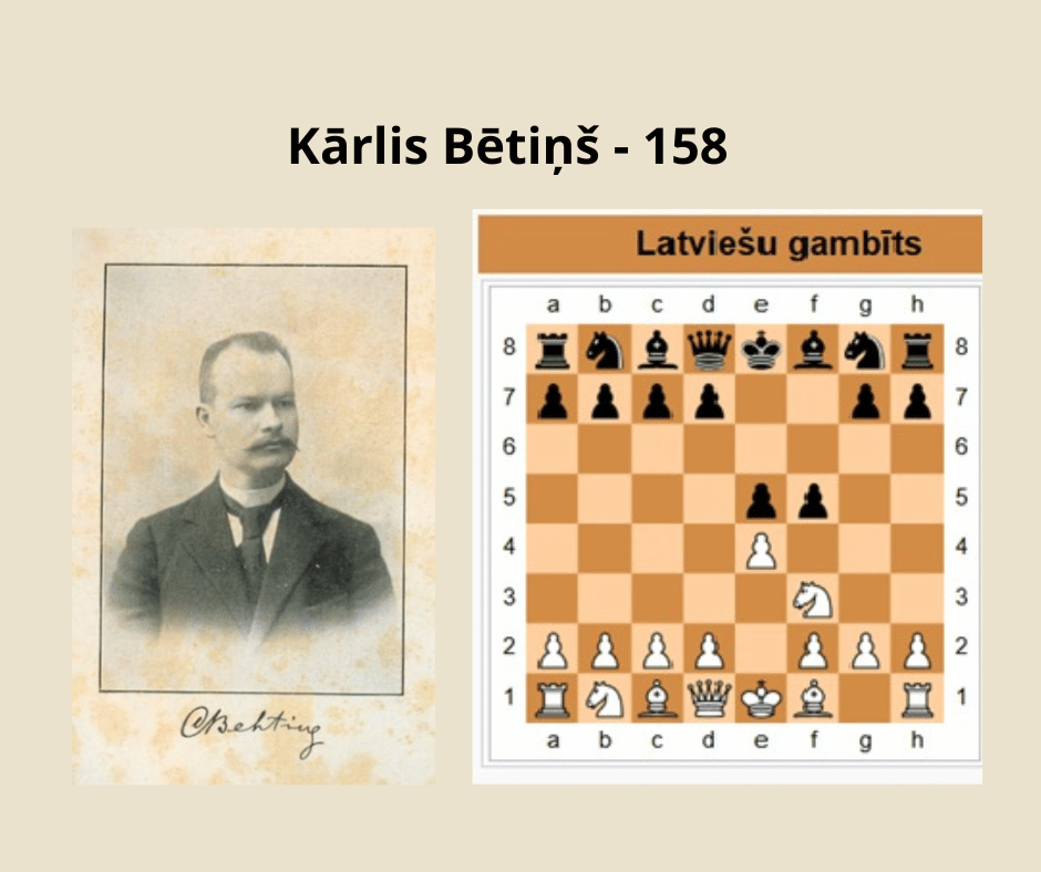 Šodien mazliet ieskatīsimies šaha vēsturē, jo šajā dienā tieši pirms 158 gadiem, 1867.gada 27.oktobrī ir dzimis ievērojams Latviešu šahists un problēmists Kārlis Bētiņš. Viņš sekmīgi darbojies arī atklātņu teorijas pētīšanā, kā rezultātā radusies atklātne Latviešu gambīts, tādējādi ierakstot Latvijas vārdu arī šaha atklātņu enciklopēdijā. Ar kodu C40 tur ir atrodams brāļu Bētiņu izstrādātais Latviešu gambīts.